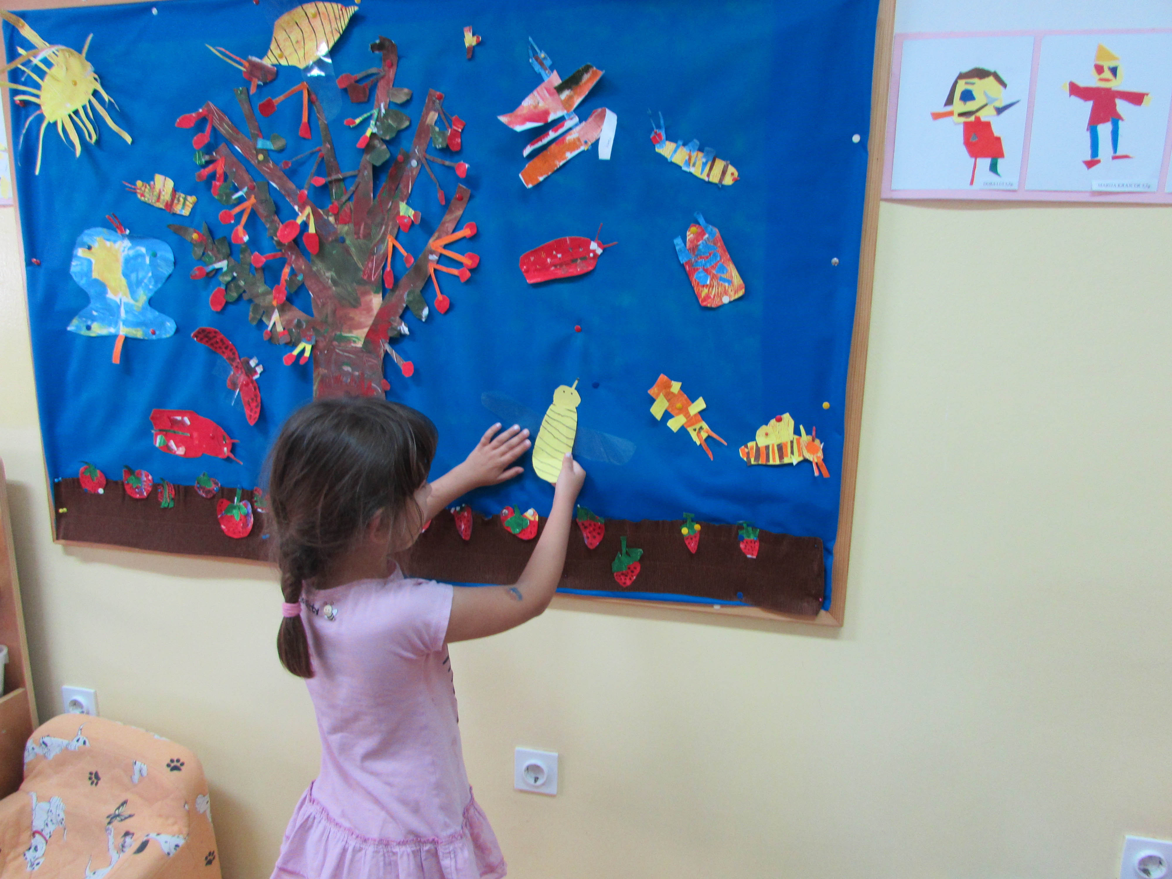 Djeca iz skupine "Leptirići"oblikovali su sezonsko voće i kukce od toniranog papira, kojeg su djeca sama bojalatemperom i različitim pomagalima(valjcima i spužvicama različitih boja).