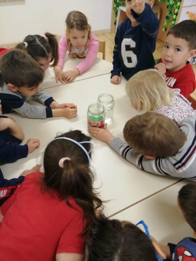 U sklopu projekta ˝Ekologija - Male ruke za velika djela˝ razgovaramo o vodi, o važnosti čiste vode, kome je sve voda potrebna, kakva sve može biti (hladna, topla, mlaka), u kojim je oblicima možemo vidjeti u prirodi (kiša, snijeg, led, para). Radimo eksperiment sa vodom; razumijevanja pojmova bistra - mutna, čista - nečista/zagađena.