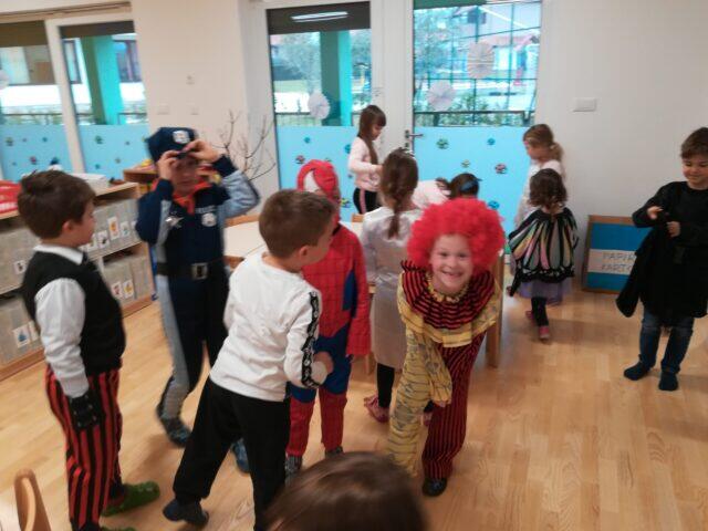 Izradili smo maske od kaširanog balona i kolaž papira, ukrasili smo maske za lice geometrijskim likovima, svakodnevno smo se maskirali, plesali, pjevali i igrali se maskirani.